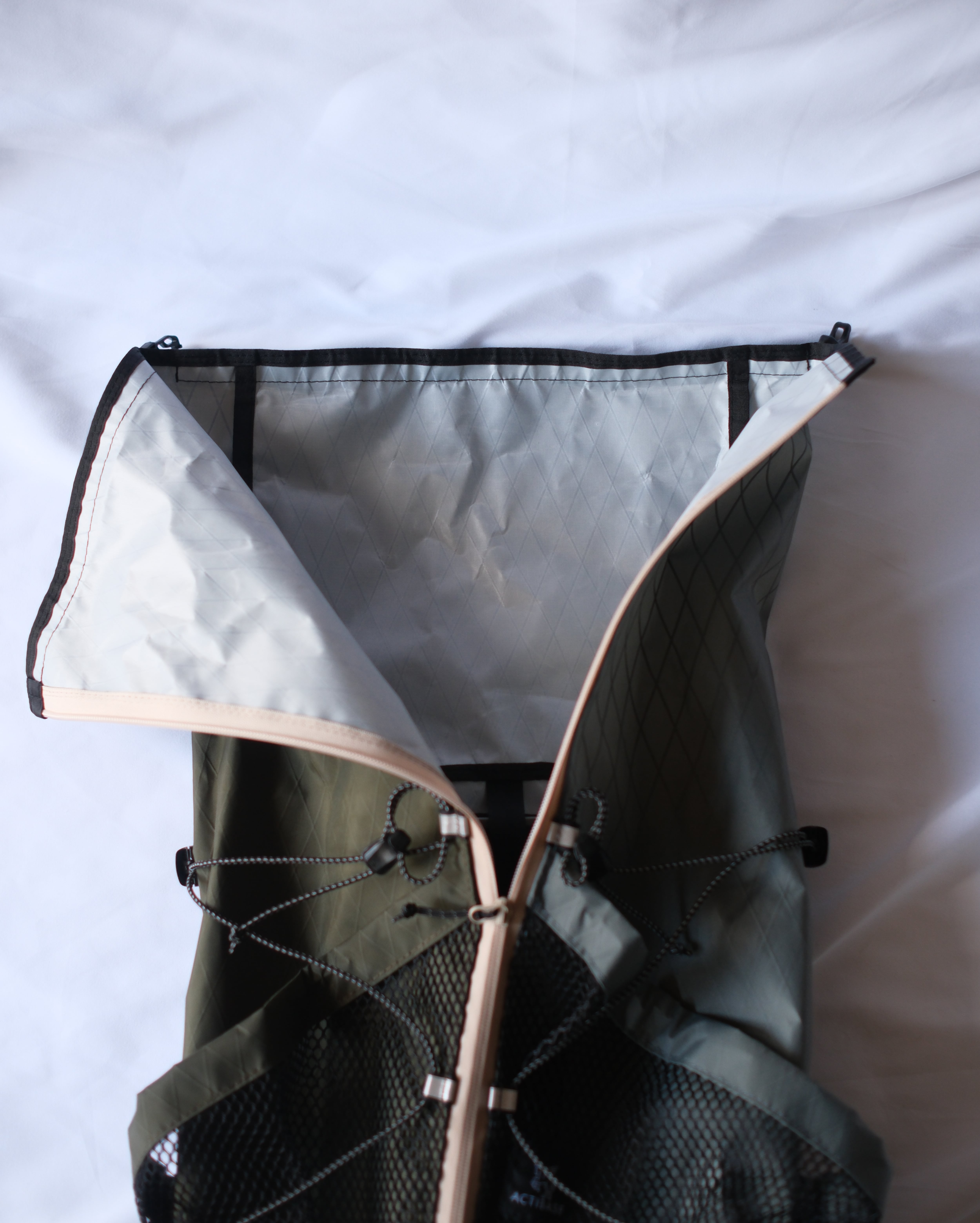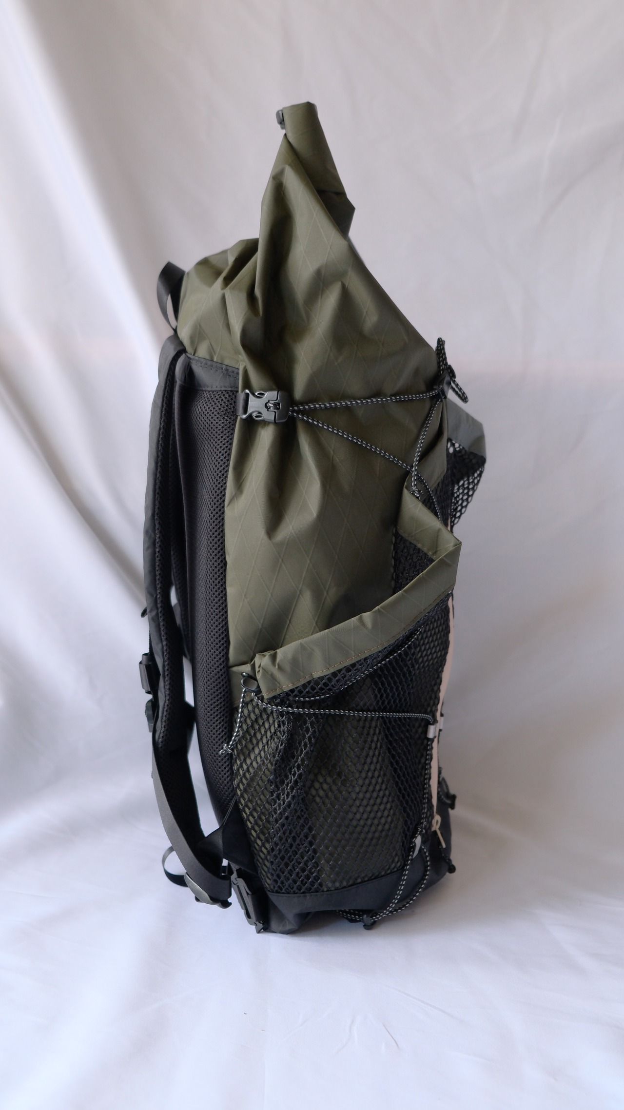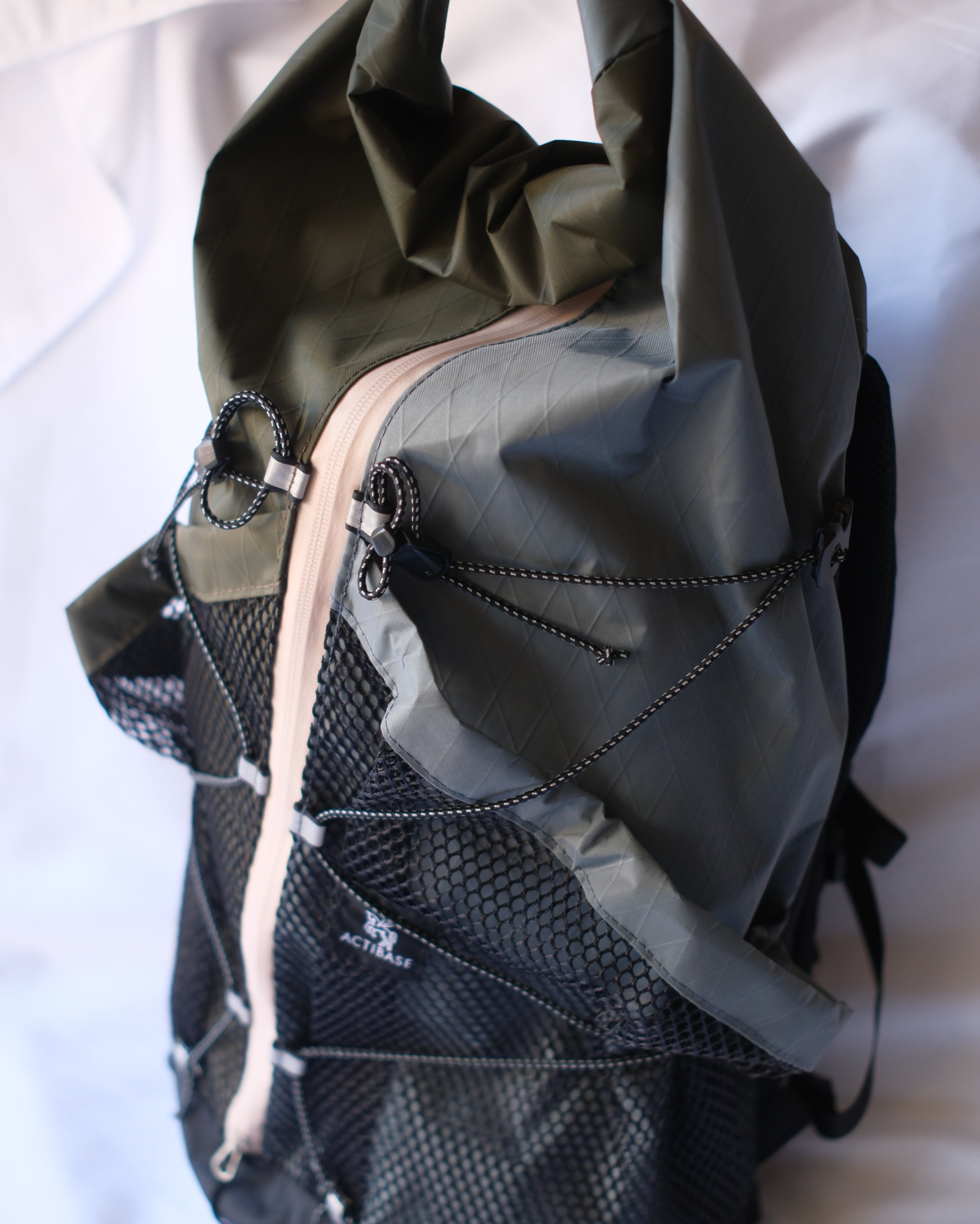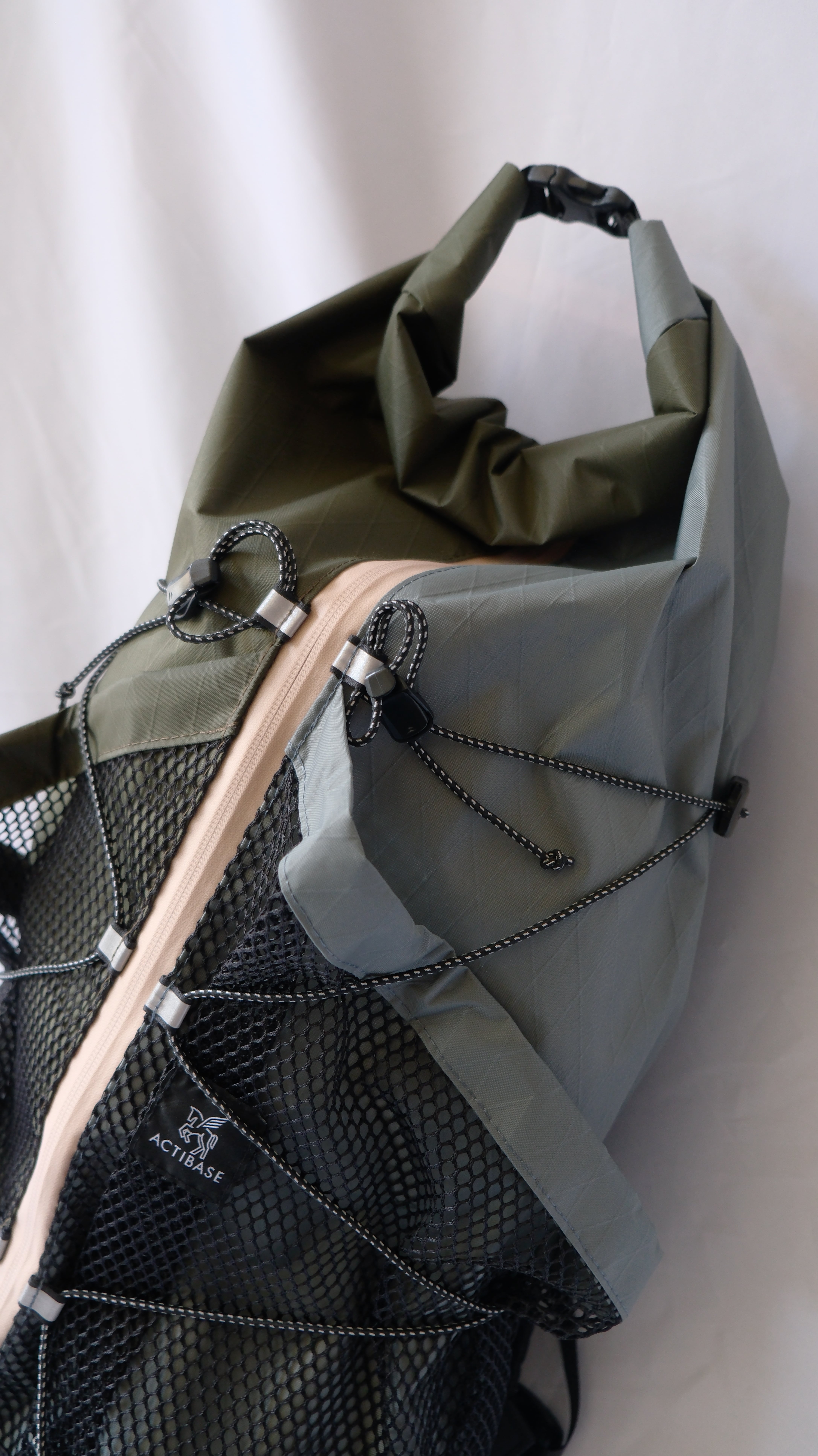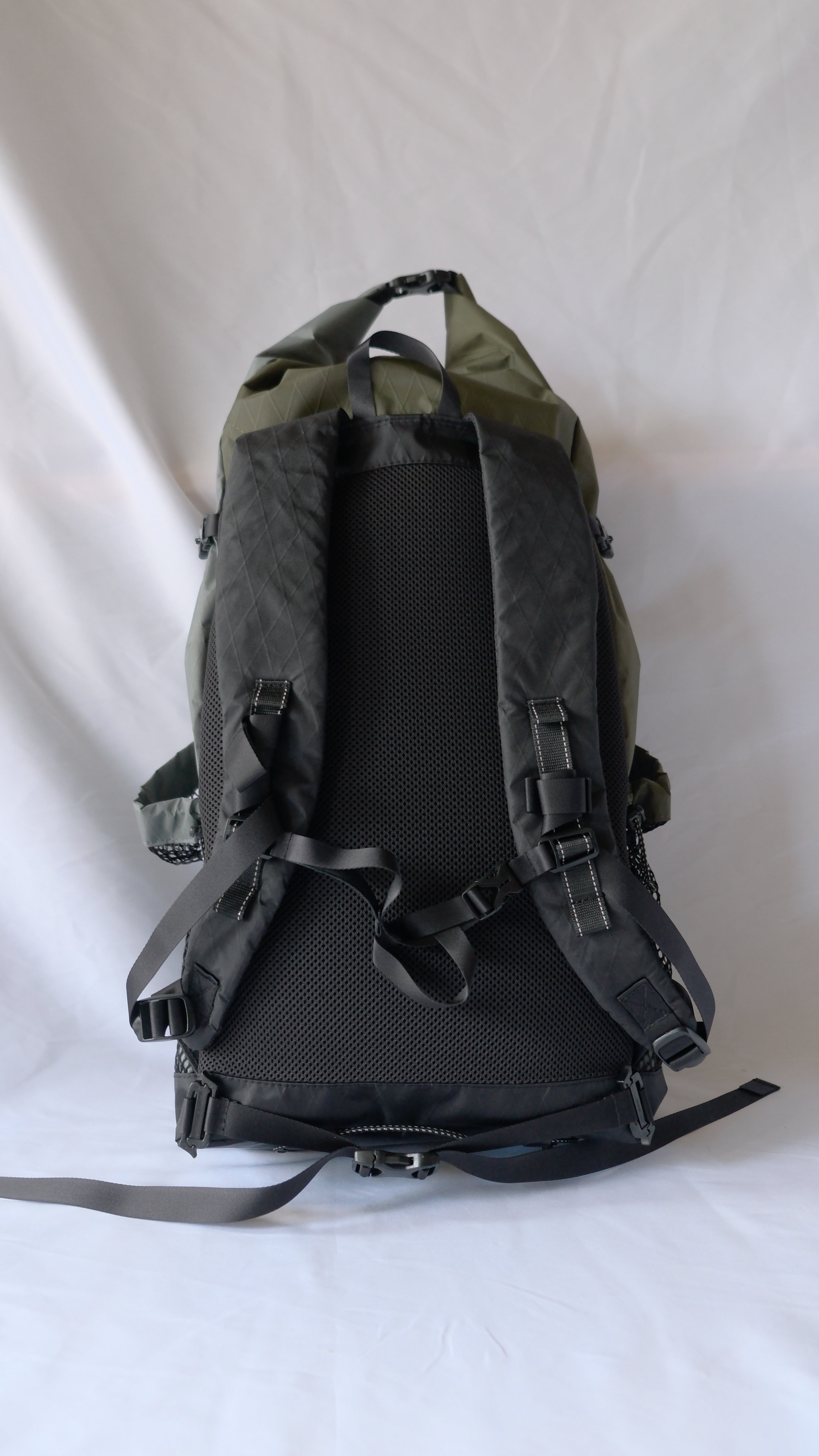 ◼︎容量は約30Lで、日帰りハイクから小屋泊をするのに最適。コンパクトで軽量なギアを詰め込めばテント泊も可能なサイズ感。背面にはハイドレーション用のスリットも完備。上部はロールトップを採用し、絞り込むことで容量の可変も自在にできるので、アウトドアだけでなく、タウンユースにもおすすめ。