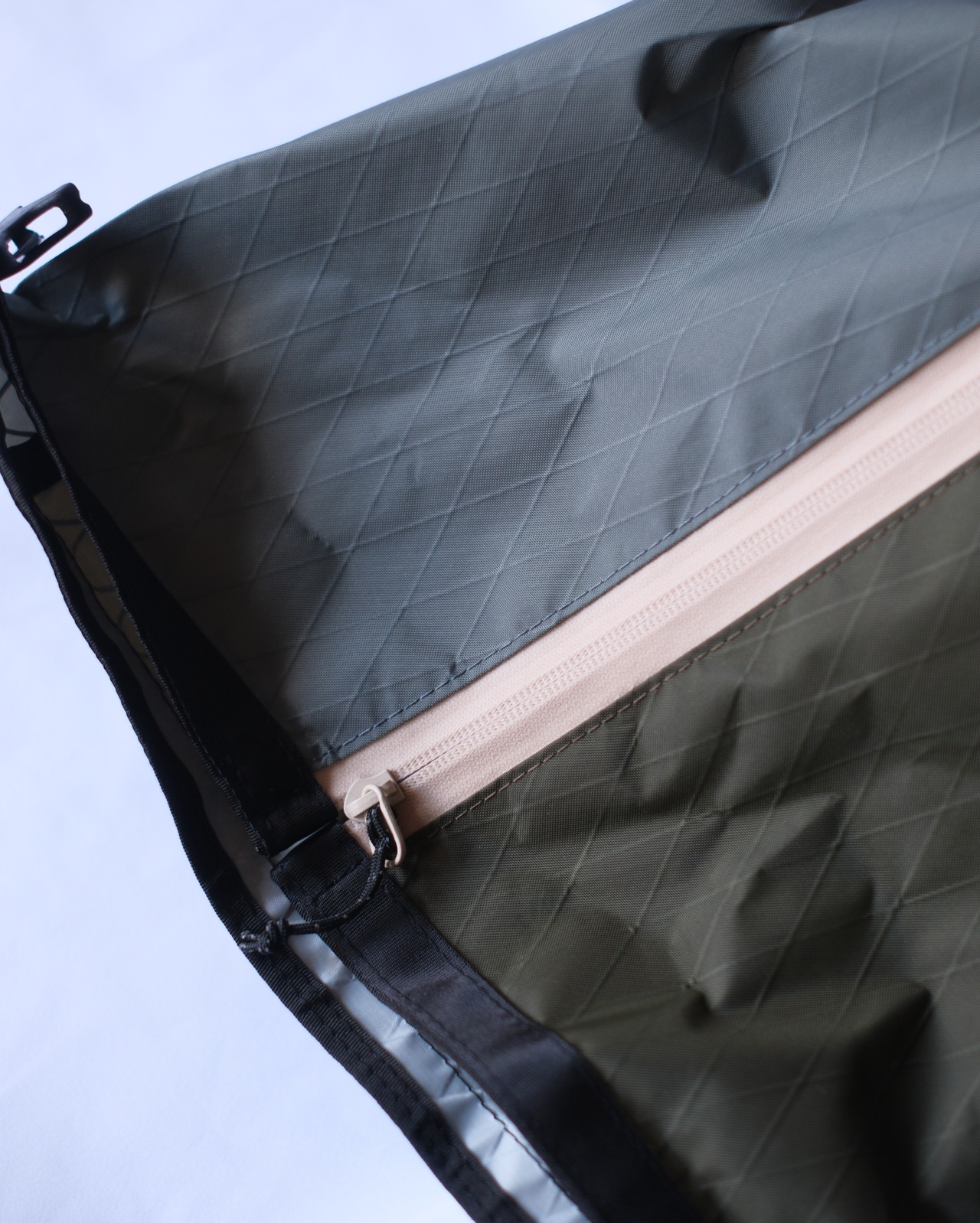 メインポケット中央に止水のフロントファスナーを配置し、ロールトップを閉じたまま荷物の出し入れが可能に。ダブルファスナーなので上からも下からも内部にアクセスできるので、下の方に入れたギアを取り出したい時も、上から全部出さずに、ジップを開けてアクセスできます。
