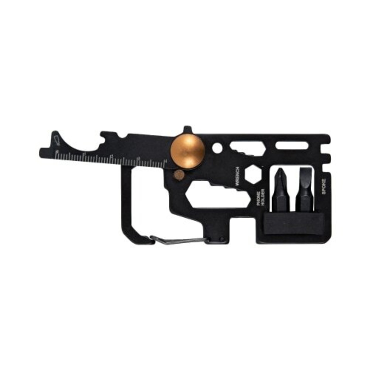 ①ボトルオープナー②定規③スクリュードライバー④マイナスビット⑤プラスビット⑥六角レンチ⑦携帯ホルダー⑧バタフライレンチ⑨カラビナ⑩スポーク