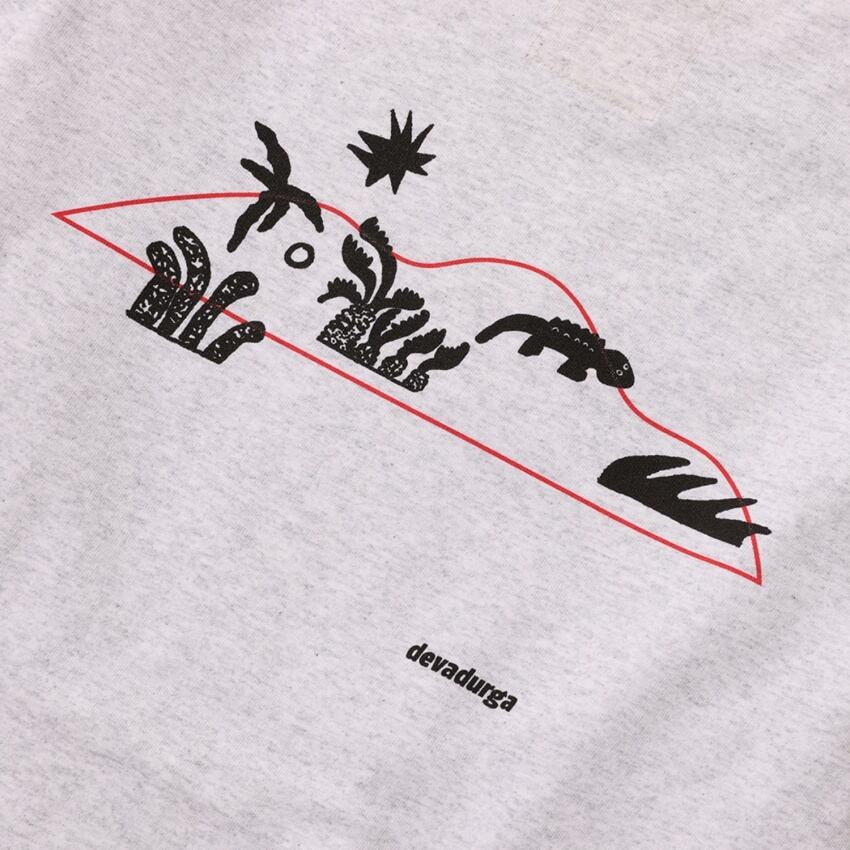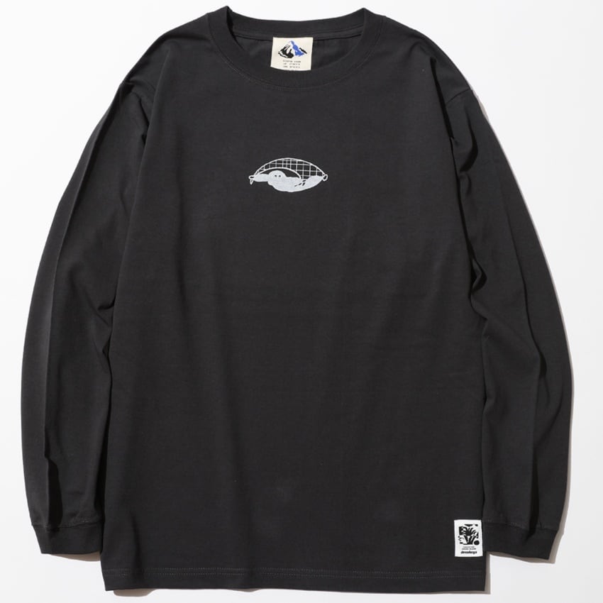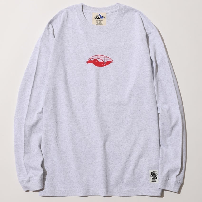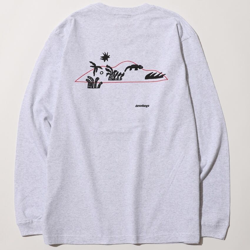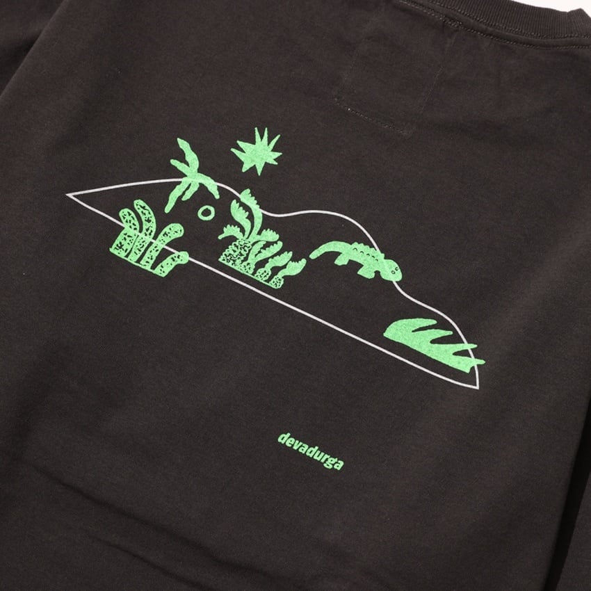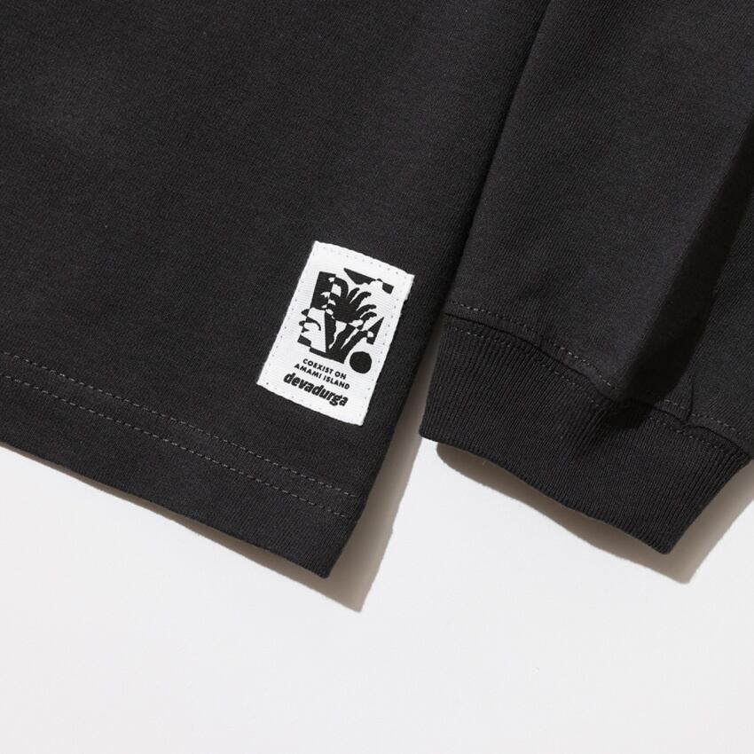 奄美らしい動植物などのいろんなモチーフをスタンプのようにバックプリントに落とし込んだロングスリーブTシャツ。