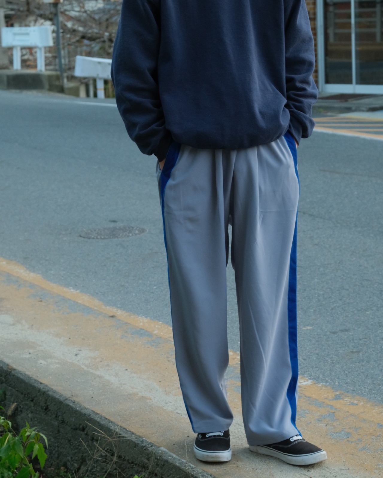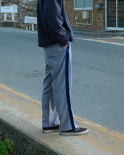 今回のSCHOOL PANTSはサイドに太ベロアテープを配置しました。 スタイルはいつも通りヒップをややゆったりさせ、ライトなジャージ素材を使用し、 ウエストにはタックをいれてます。