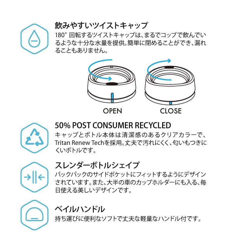 キャップとボトル本体は清潔感のあるクリアカラーで、Tritan Renew Techを採用。丈夫で汚れにくく、匂いもつきにくいボトルです。