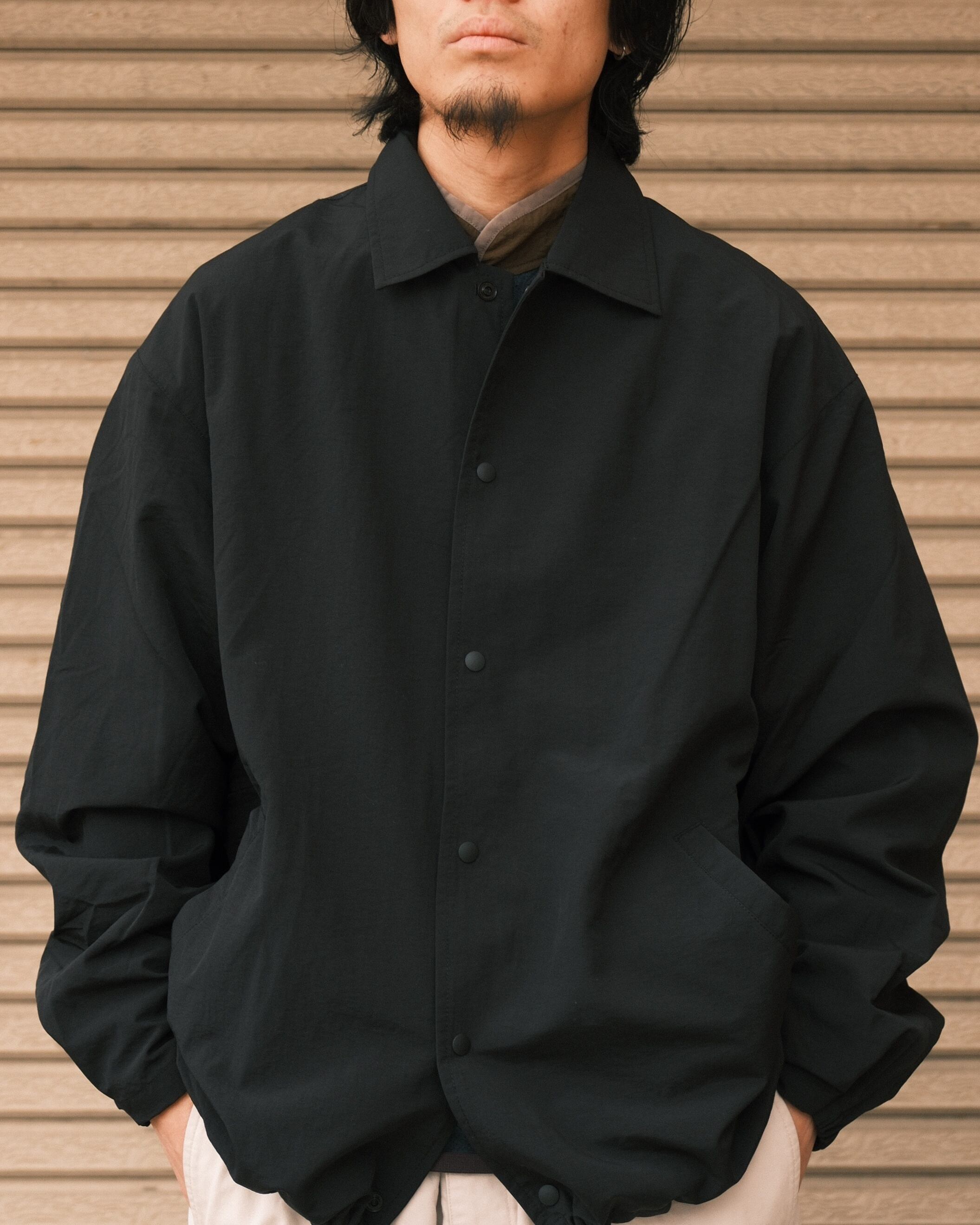 ベーシックなコーチジャケットをベースに、現代的なシルエットとサイジングで再構築。