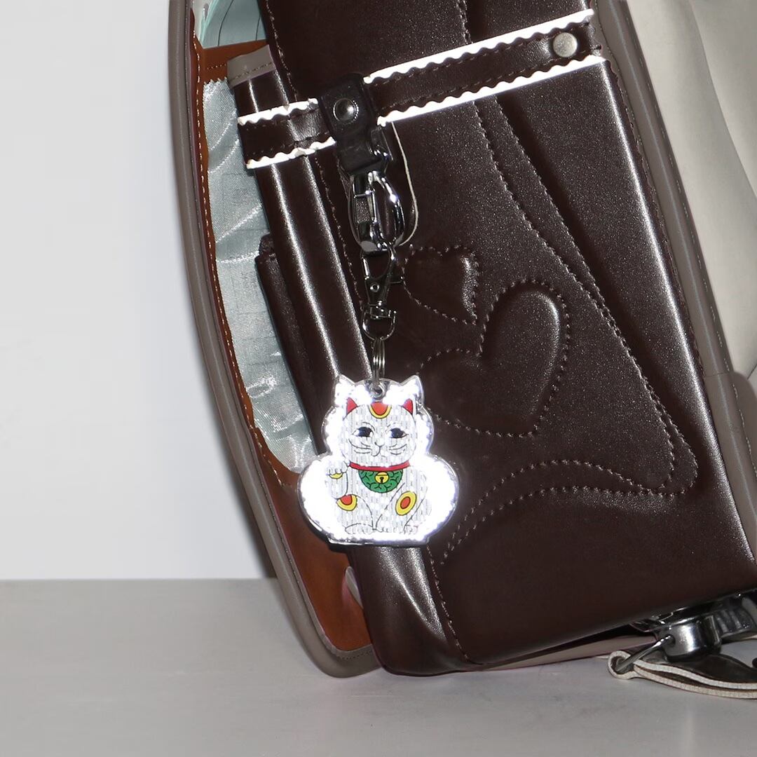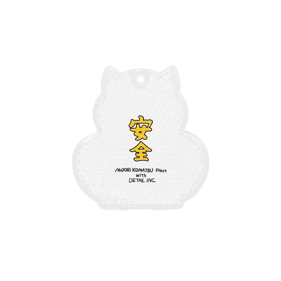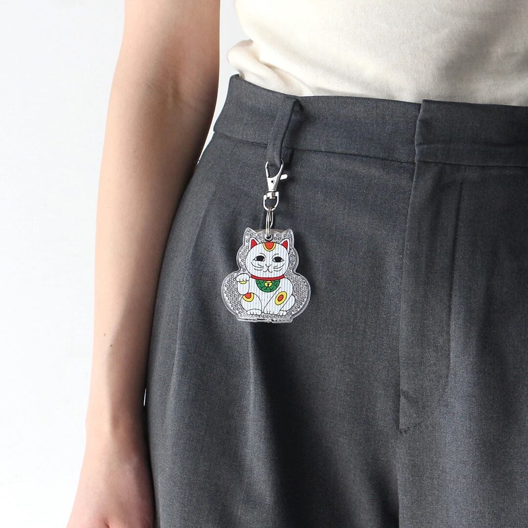 ちょっとシュールで愛らしい表情の招き猫がこちらを見つめる、癒し系のリフレクター。裏面には筆文字風の「安全」の文字がデザインされ、お守りのように日常の安全を見守ってくれます。
