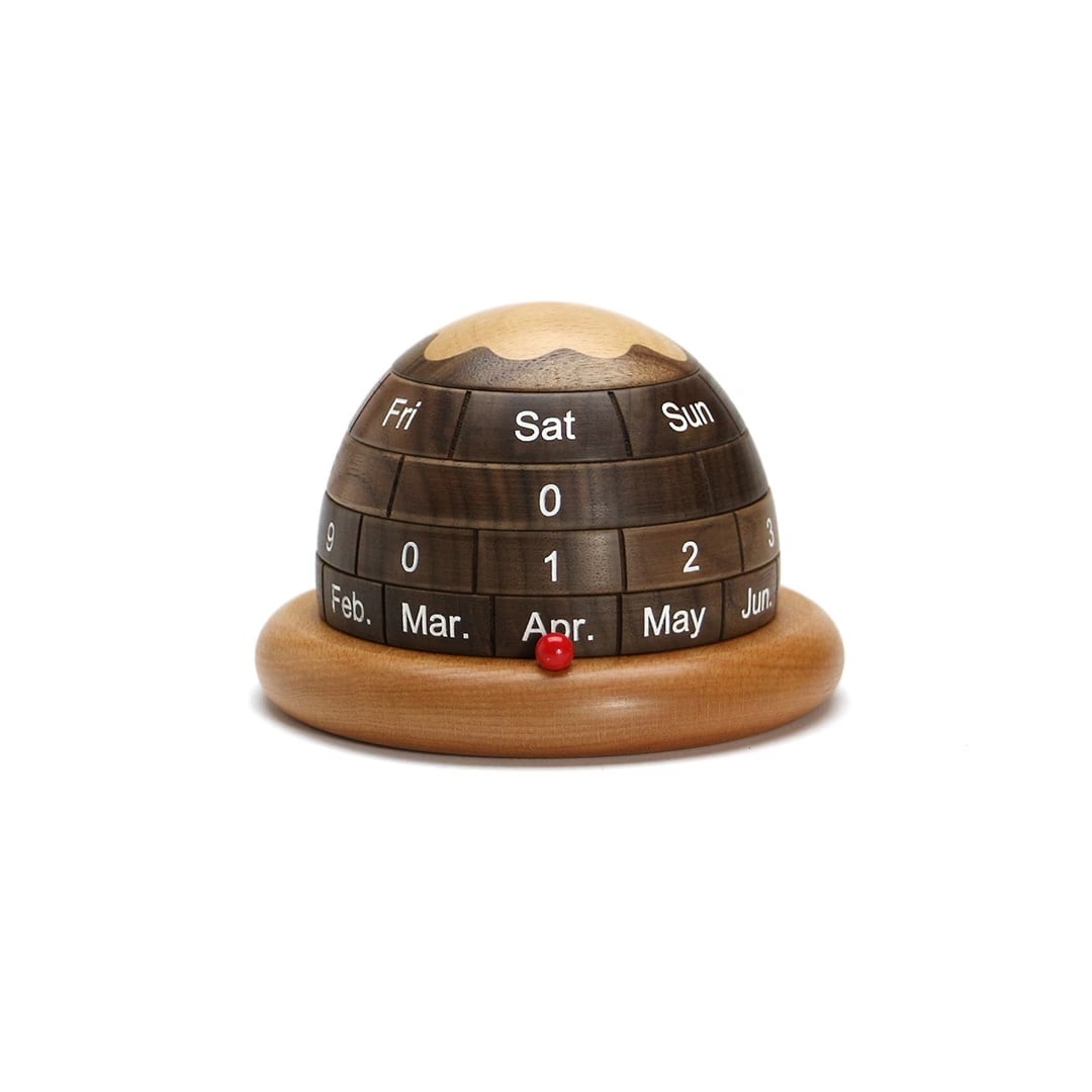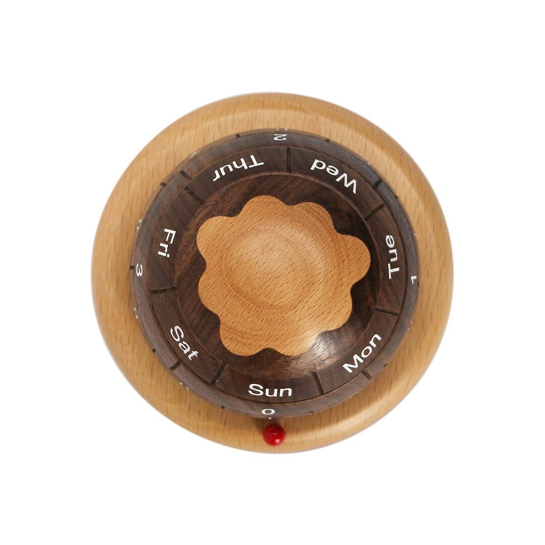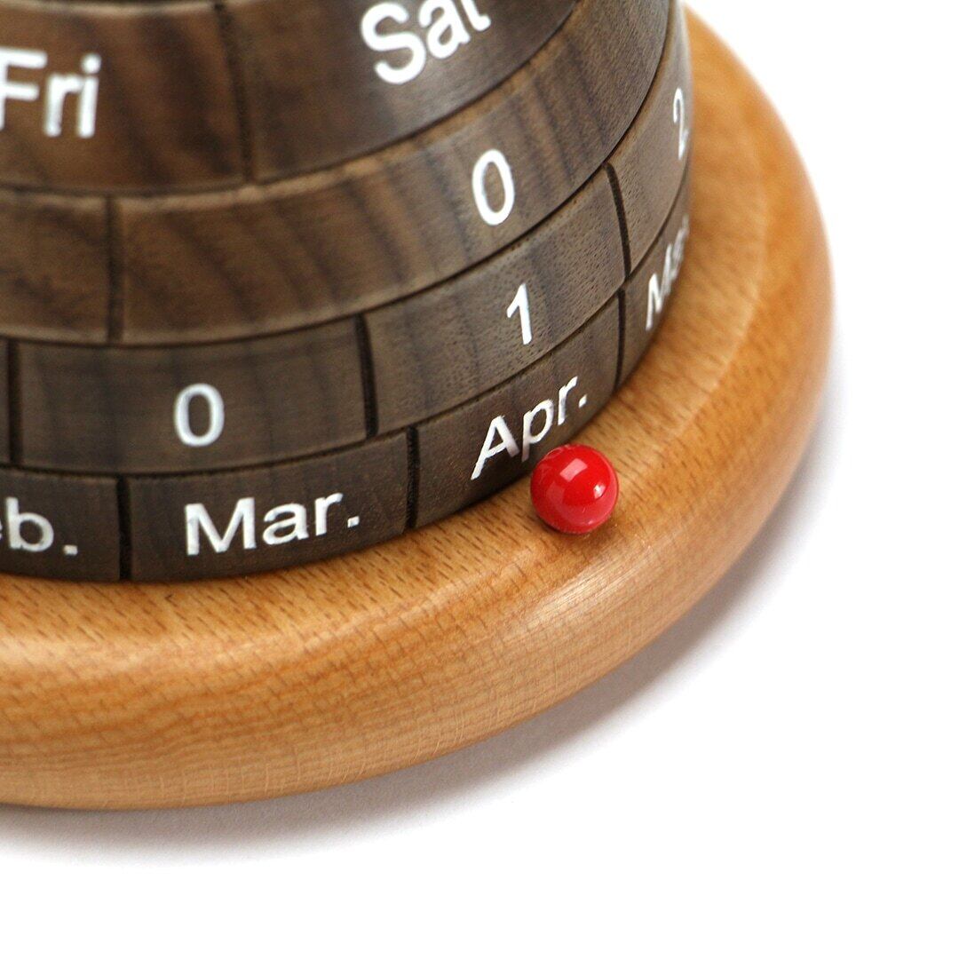土台にある赤の目印部分を軸とし月、日、曜日をそれぞれ回して設定します。毎朝日付を合わせるその一手間が愛おしくなるようなデザイン。