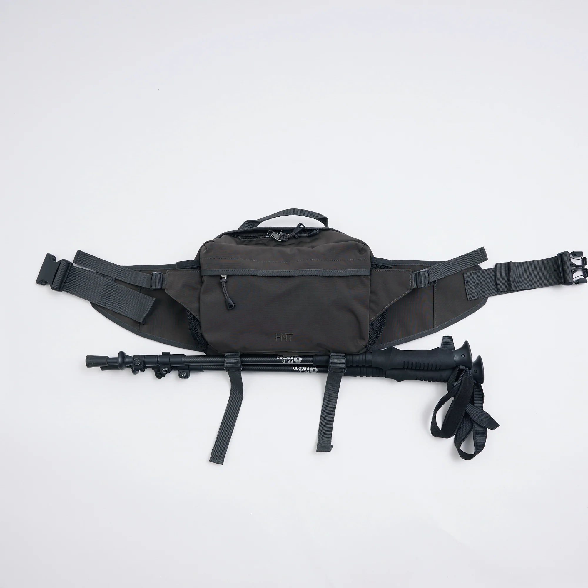 本体下部のアジャストベルトを使えば、トレッキングポールなどの長物も固定できます。荷物は最小限に、行動範囲は最大限に。